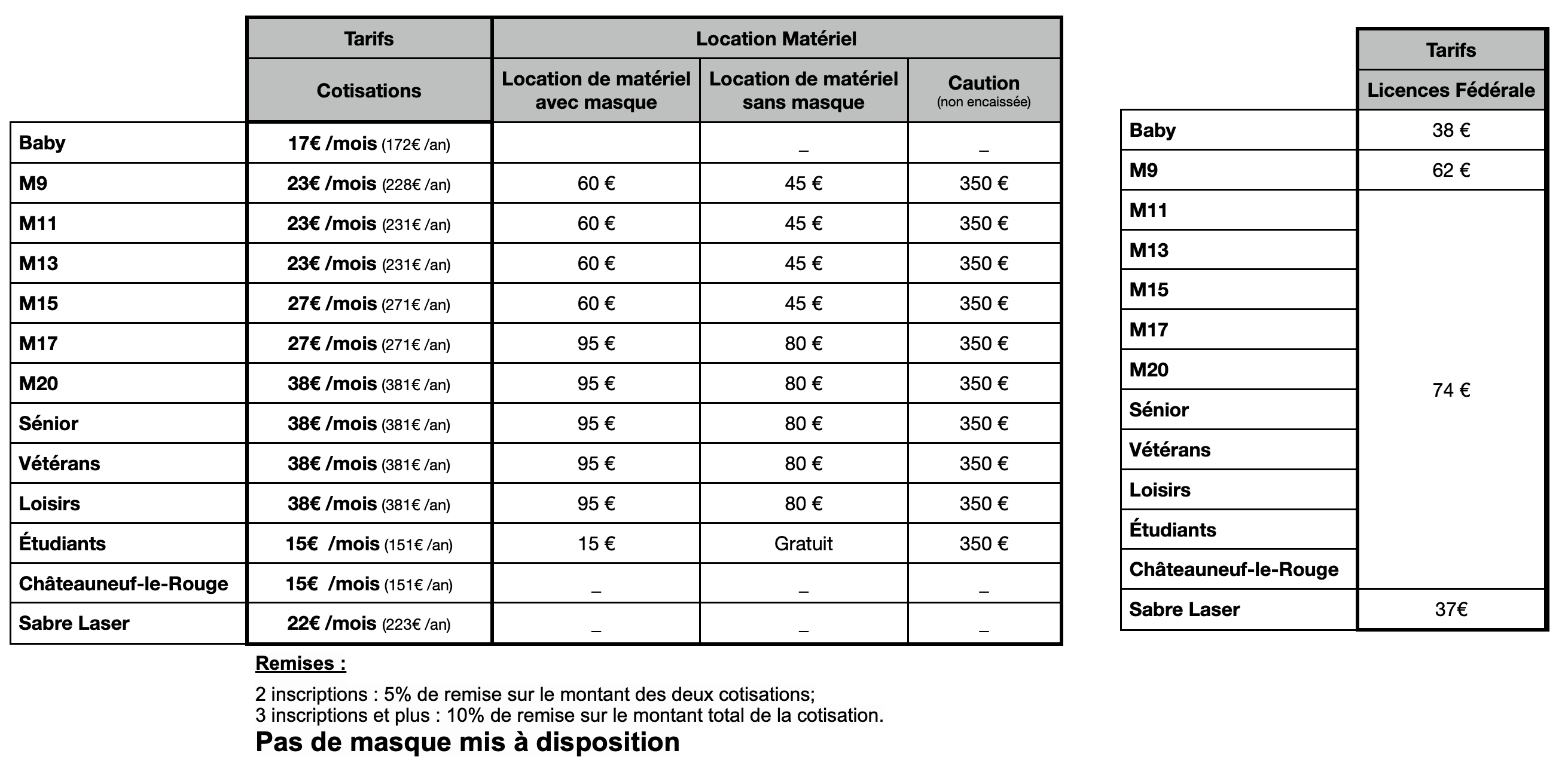 Le club ne met plus à disposition de masque (hors essais) lors des cours, le tireur devra soit fournir lui même un masque ou en louer un auprès du club.